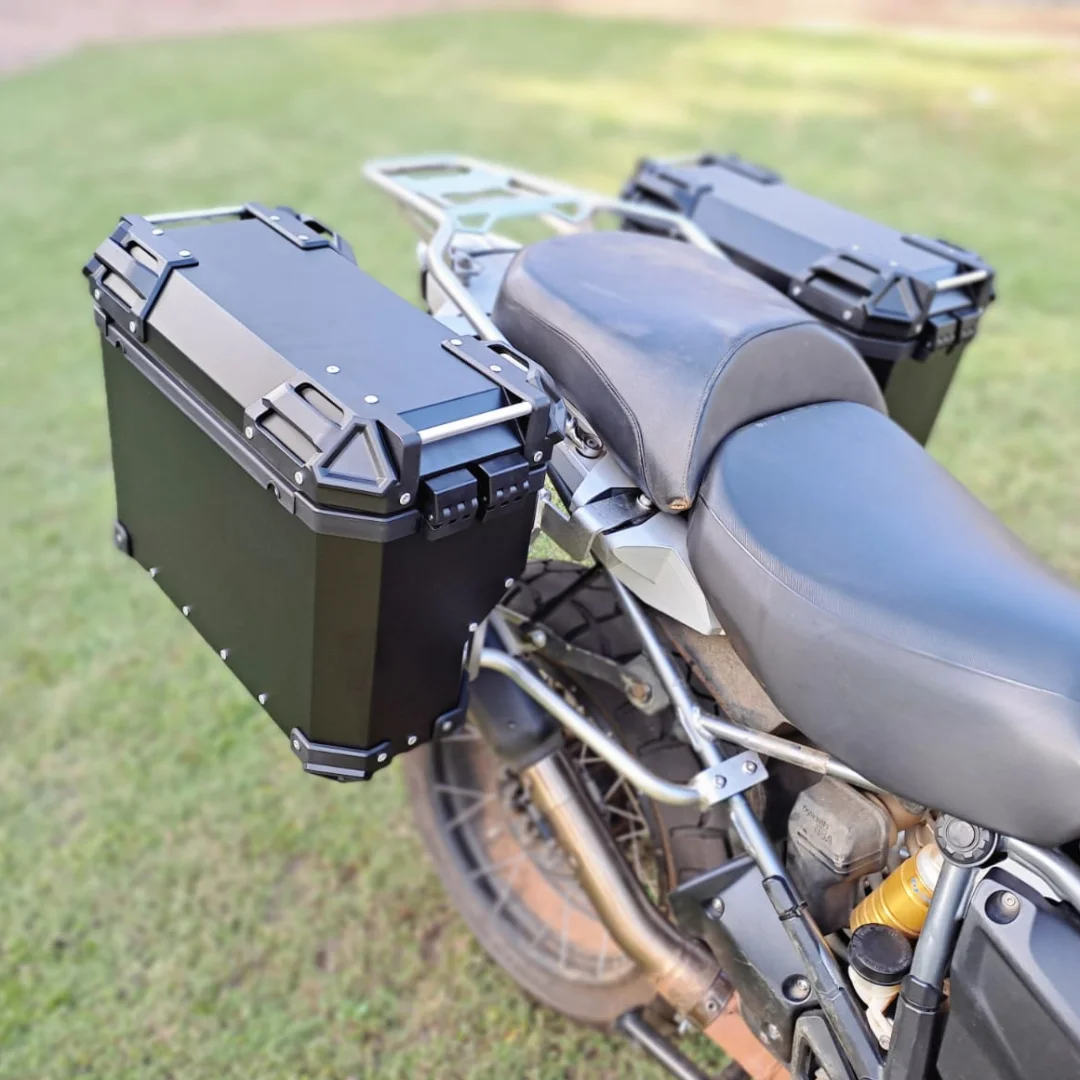 Pannier box is a type of hard-sided luggage that attaches to the sides of the motorcycle, typically near the rear.
